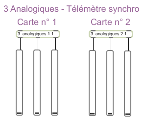 Dans cet exemple deux télémètres sont branchés l'un à la suite de l'autre autre. Les capteurs analogiques sont reçus séparément.