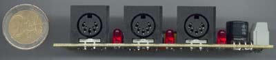 Midi placé en amont. Caractéristiques techniques- Trois témoins d'activité Midi : données entrant sur chaque entrée, données sortant sur la sortie commune.