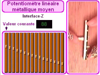 Visualisation des données envoyées par ce capteur : video Pot-lin-log-IZ.mov. Cet affichage a été fait dans Isadora. L'aspect logarithmique de la réponse se voit en comparant la position du curseur du capteur avec les données affichées. La donnée la plus récente est à gauche.