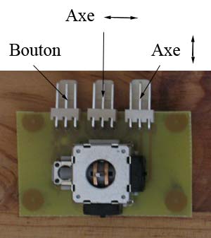 Ce capteur est composé de deux potentiomètres ainsi que d'un bouton interrupteur. Il possède donc trois sorties analogiques 3 points (une par potentiomètre et une pour l'interrupteur) qui se branchent par exemple